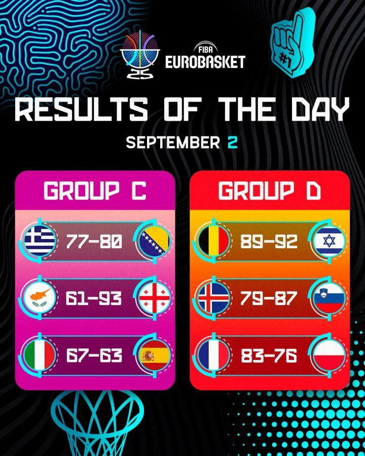 直播吧09月03日讯 男篮欧锦赛当地时间9月2日的6场小组赛全部结束,详细赛果如下: